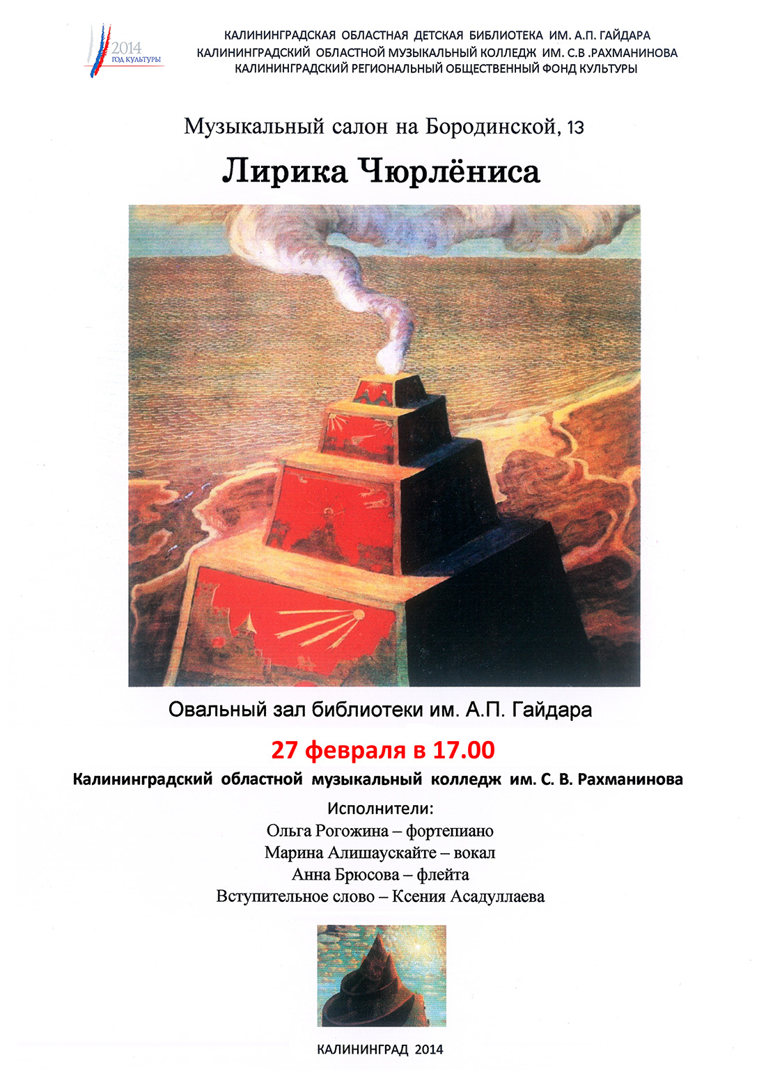 К концерту 27 февраля готовились не только музыканты. Сотрудники библиотеки им. Гайдара подготовили выставку книг о М.К. Чюрлёнисе и репродукций картин художника. Дизайн-макет афиши концерта разработан заслуженным художником России Нелли Смирнягиной. На концерте присутствовала Лайма Мещерякова – представитель Калининградского общества литовской культуры имени Людвига Резы. Сувениры от Генерального Консульства Литовской республики в Калининграде для исполнителей программы передал атташе по культуре Романас Сенапедис.