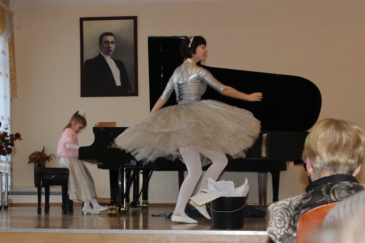 Выступление Александра Калмыкова (2 курс НИ, класс преп. И.А. Готовчик) тоже окрашено комедией. Песенка «Перевоз Дуня держала» в исполнении домры с фортепианным аккомпанементом. Как это было оформлено? Центральная фигура – Калмыков. За роялем – концертмейстер Н. И. Шарипова. И так называемый «сборный оркестр» – фагот, туба, саксофон, бас-балалайка, скрипка, барабаны. Дмитрий Сербул (3 курс НИ) в дирижерском фраке. В итоге получилась сценка, где «оркестранты» никак не могут вступить, несмотря на все отмашки дирижера. Примерно к середине исполнения они начали уходить, а «дирижер» сел на ступеньку в полном отчаянии. Наконец из «фона» осталась только бас-балалайка.
