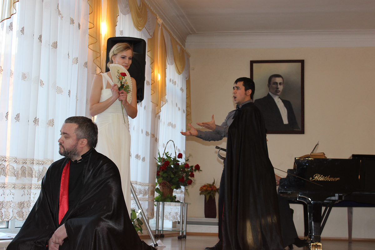 Атмосфера концерта 25-го января была необычной для стен Большого зала Калининградского областного музыкального колледжа им. С. В. Рахманинова. Не просто концерт, а театрализованное представление с самыми разными героями… Современники Фигаро в париках и с пистолетами, испанские идальго, бьющиеся за сердце прекрасной дамы не шпагами, а песнями, наконец, воплощенные фантазии из фильмов ужасов. Фольклорный ансамбль «Матица» порадовал плясовой, правда, в середине песни они грянули современный поп-хит, но в конце концов допели её до конца. А в конце номера на платках девушек оказались буквы: «ДЕНЬ СТУДЕНТА».