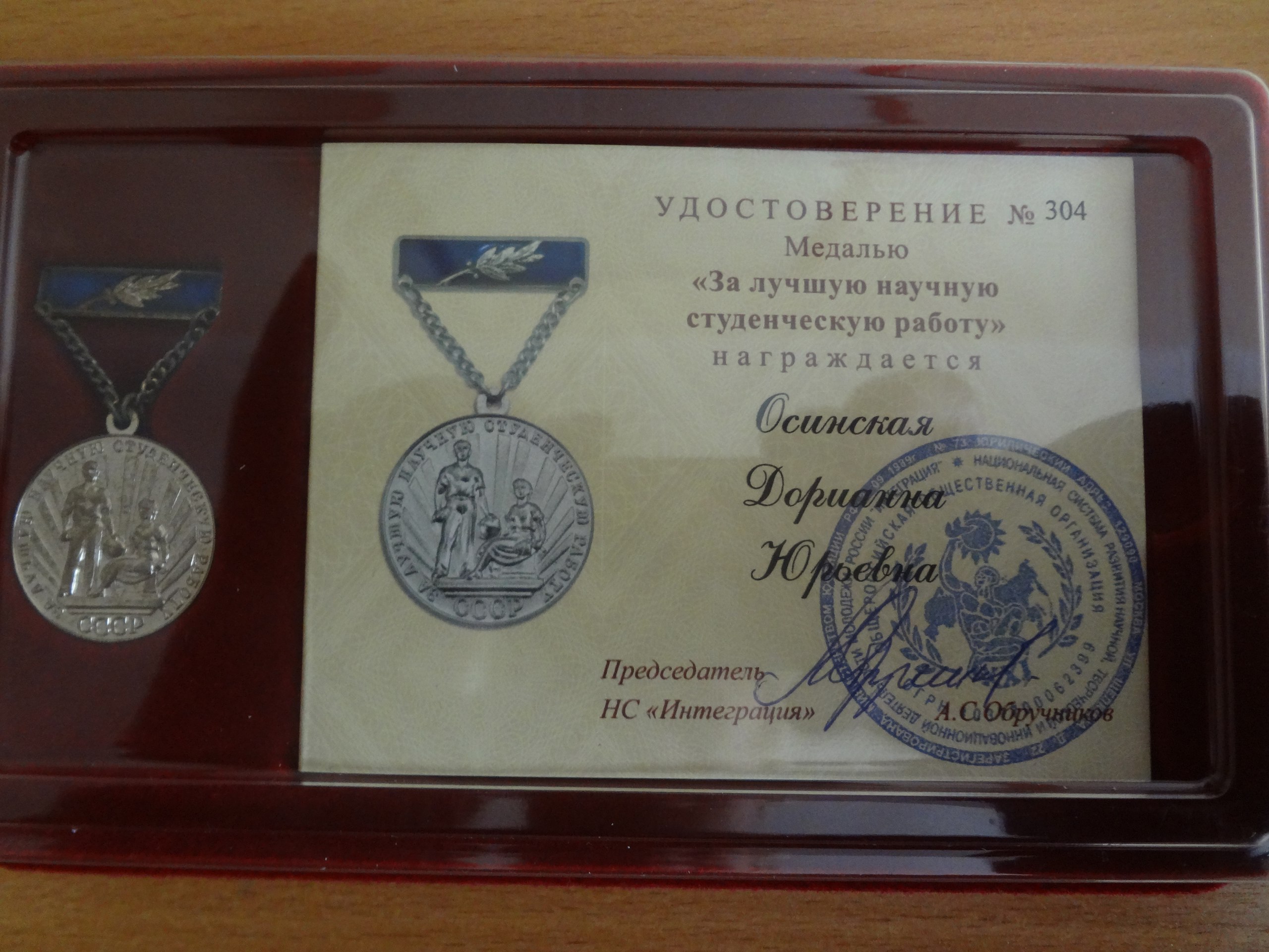 Решением экспертного жюри эта работа была удостоена Диплома 1 степени и медали «За лучшую научную студенческую работу» (удостоверение № 304)