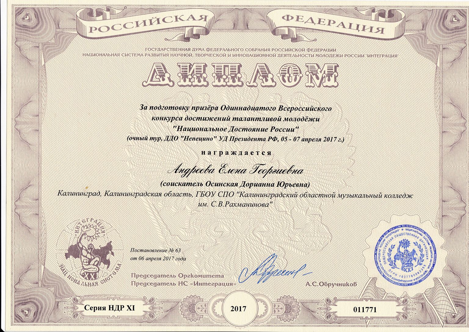 Научный руководитель - преподаватель музыкального колледжа Андреева Елена Георгиевна награждена Дипломом «За подготовку призёра XI Всероссийского конкурса достижений талантливой молодёжи «Национальное Достояние России» (очный тур, ДДО «Непецино» УД Президента РФ, 05-07 апреля 2017 г.) и знаком отличия «За успехи в научно-исследовательской работе студентов» (удостоверение № 342)