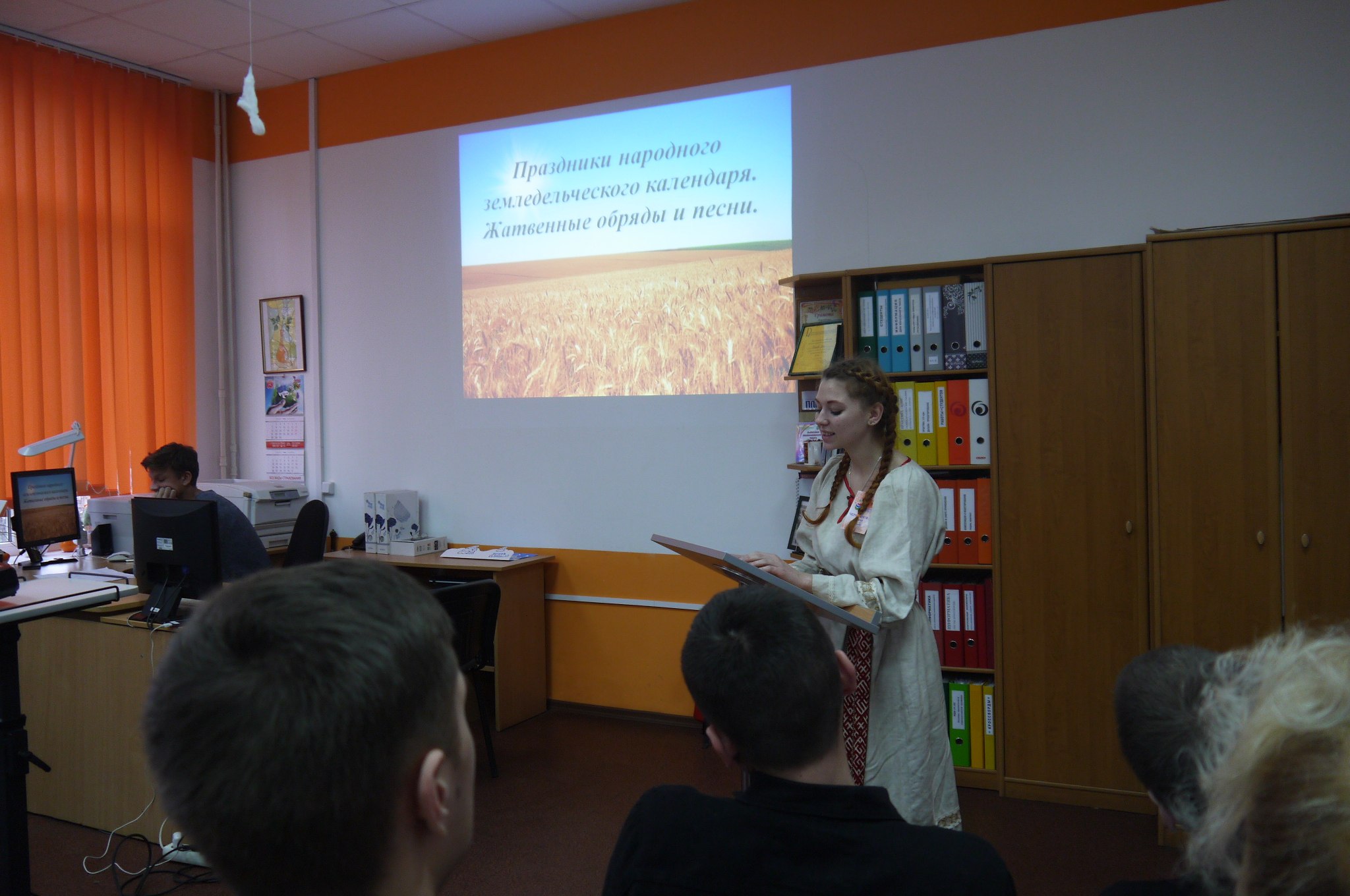 Студентка I курса отделения сольное и хоровое народное пение Черепанова Диана подготовила работу на тему «Праздники народного земледельческого календаря. Жатвенные обряды и песни» (секция 1). Руководитель – Зданчук Т.А., преподаватель общеобразовательных дисциплин. Упоров Максим, студент I курса отделения музыкальное звукооператорское мастерство, руководил презентацией.