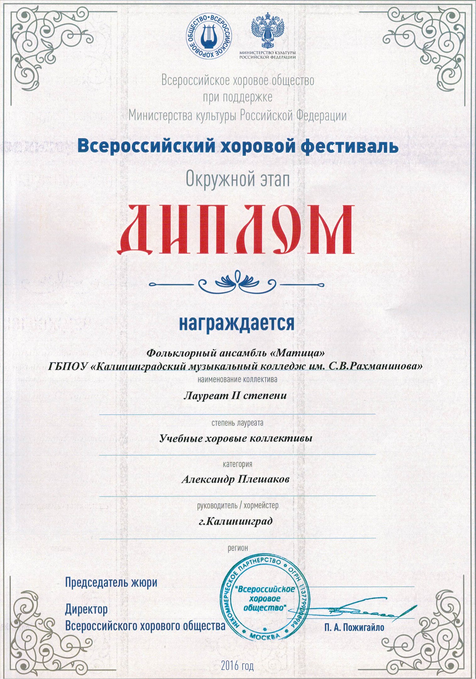 Фольклорный ансамбль «Матица» Калининградского областного музыкального колледжа им. С.В. Рахманинова достойно представил народную музыкальную культуру нашего региона, став Лауреатом II степени среди учебных хоровых коллективов.
