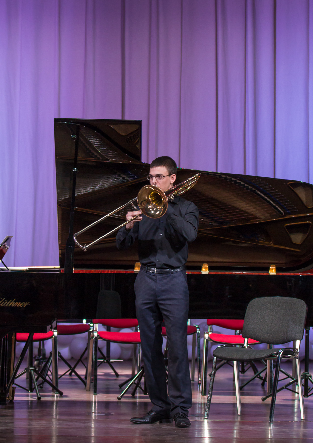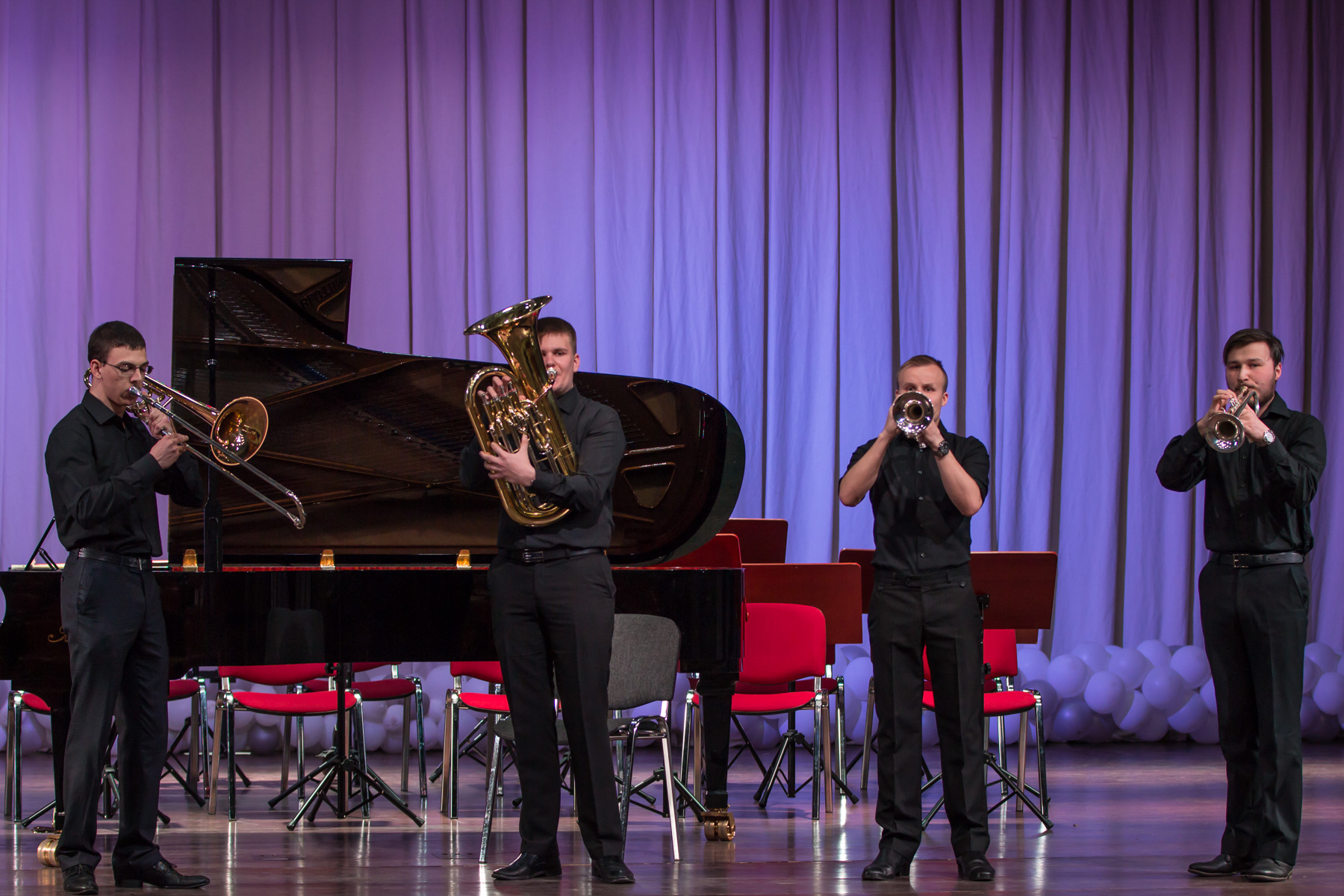 Александр Владимирович создал класс, в котором ученики играют на разных инструментах семейства медных духовых. На концерте звучали произведения русских и зарубежных композиторов в ярком блестящем тембре трубы, мягких насыщенных красках баритона, эуфониума, тромбона, приглушенном «говоре» тубы.
