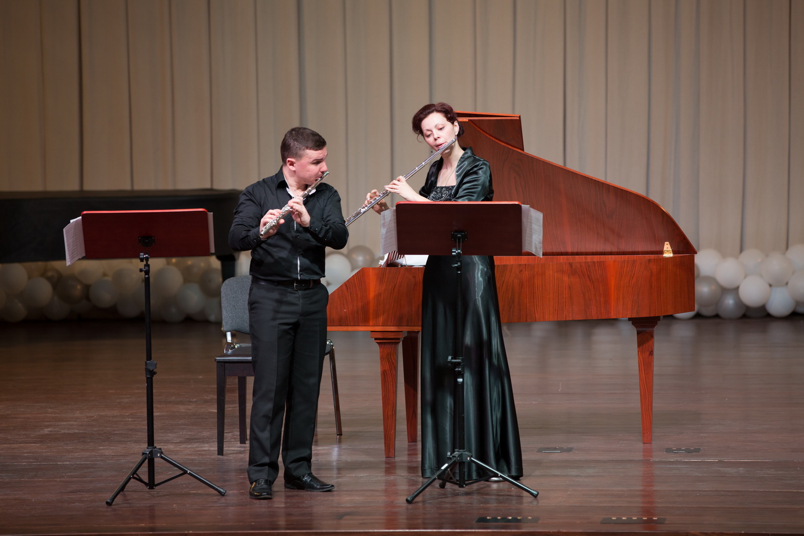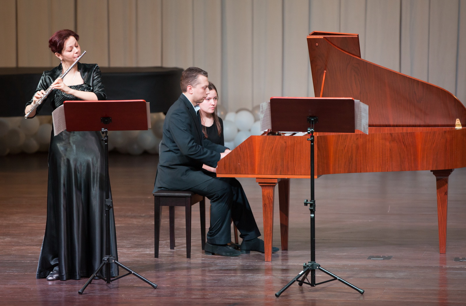 Звучали редко исполняемые на калининградской сцене дуэты для двух флейт (4-х частный дуэт Телеманна, Рондо из «Гамбургской сонаты» К.Ф.Э.Баха, очаровательный дуэт из «Кофейной кантаты» И.С.Баха) и три сонаты для флейты и баса континуо И.С. Баха.