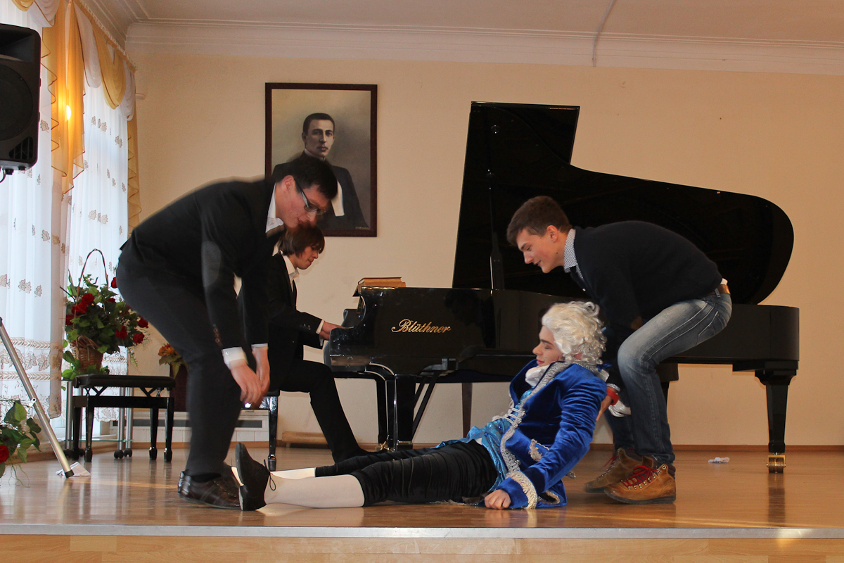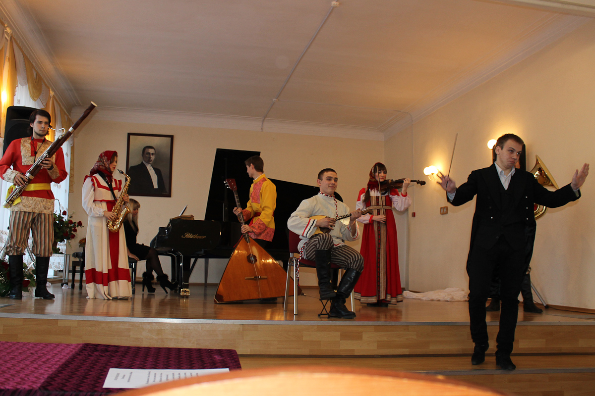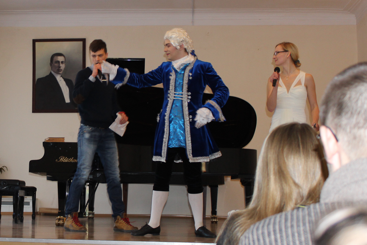 Атмосфера концерта 25-го января была необычной для стен Большого зала Калининградского областного музыкального колледжа им. С. В. Рахманинова. Не просто концерт, а театрализованное представление с самыми разными героями… Современники Фигаро в париках и с пистолетами, испанские идальго, бьющиеся за сердце прекрасной дамы не шпагами, а песнями, наконец, воплощенные фантазии из фильмов ужасов. Фольклорный ансамбль «Матица» порадовал плясовой, правда, в середине песни они грянули современный поп-хит, но в конце концов допели её до конца. А в конце номера на платках девушек оказались буквы: «ДЕНЬ СТУДЕНТА».