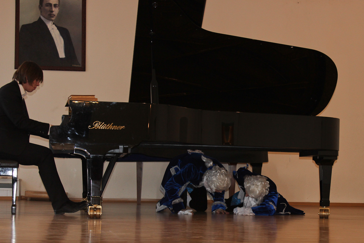 Выступление Александра Калмыкова (2 курс НИ, класс преп. И.А. Готовчик) тоже окрашено комедией. Песенка «Перевоз Дуня держала» в исполнении домры с фортепианным аккомпанементом. Как это было оформлено? Центральная фигура – Калмыков. За роялем – концертмейстер Н. И. Шарипова. И так называемый «сборный оркестр» – фагот, туба, саксофон, бас-балалайка, скрипка, барабаны. Дмитрий Сербул (3 курс НИ) в дирижерском фраке. В итоге получилась сценка, где «оркестранты» никак не могут вступить, несмотря на все отмашки дирижера. Примерно к середине исполнения они начали уходить, а «дирижер» сел на ступеньку в полном отчаянии. Наконец из «фона» осталась только бас-балалайка.