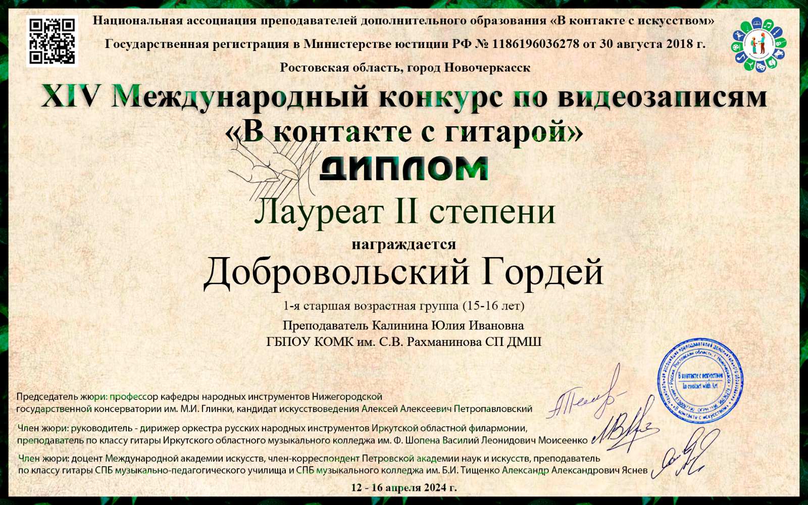с победой в Международном конкурсе, г. Новочеркасск