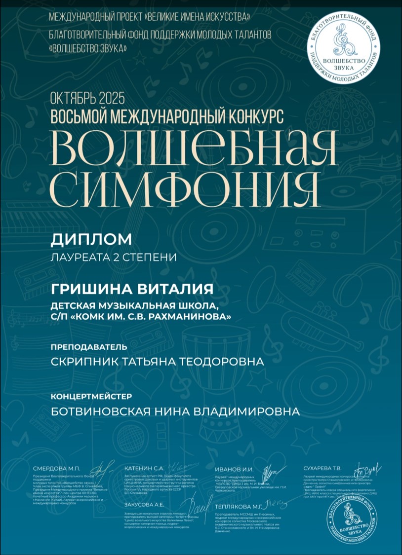 Поздравляем учащуюся ДМШ колледжа Гришину Виту, преп. Скрипник Т.Т. и концертмейстера заслуженную артистку РФ Ботвиновскую Н.В. с победой в Международном конкурсе
